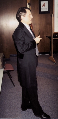 The Master Discourses In the photograph at the left, Mr Holmes addresses the youngsters about his principles of never guessing and of asking questions to arrive at truth. The kids responded with enthusiasm to Mr. Holmes' advice and went out to seek justice, truth, and wisdom. One young lady saw through the disguise completely and said that the REAL Mr. Sherwood doesn't smoke a latakia mixture but prefers a bubble-pipe blend, so it must have been the actual Sherlock Holmes!!