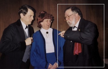 Your attention is drawn to the photograph on the right. On the left is Sherlock Holmes in disguise as John Sherwood, noted journalist; in the centre is Mrs.Hudson dressed up as Dr. Debbie Clark, administrator at the Maryland School for the Deaf; at the right is a rather long-in-the-tooth Mycroft Holmes sporting a beard and spectacles in imitation of Paul Churchill, semi-retired Latin teacher. Why these people would disguise themselves as they have is a matter of some conjecture. They were appearing at a recent gathering at the Howard County Public Library for An Evening With Sherlock Holmes for young people and their keepers. Perhaps they went incognito to avoid detection by Moriarty's henchmen. Mycroft seems to be pointing out something important, maybe the fact that their disguises are too transparent!