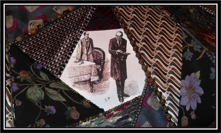 The color scheme is black and red, because of the swirl of evil created by Moriarty, silver and gray, representing the waterfall. There are also some reds, greens, and blues representing the foliage of late spring and summer during which time Mr. Holmes and Dr. Watson are traveling, and the kind of wild flowers that might be found in mountainous regions of Europe. The pattern of one tie, in particular, makes me think of waterfalls and another of the water at the base of a waterfall swirling around rocks. The black tie with red diamonds represents Moriarty's organized legions of criminals and petty crooks (work with me here). So far, seams are covered with semi-precious beads (dragon's blood jasper, garnet, and labradorite); glass seed and bugle beads; brass decorative beads; square horn beads (representing rocks); and rocailles. Additional beads will be used on the seams, and story related charms (a bust of Napoleon, a spider on its web, a serpent, etc.) will be added before the front and back of the pillow are sewn together. Then the pillow insert will be added and the black, tasseled and beaded trim sewn on so the pillow will be ready for the Denizens' meeting.